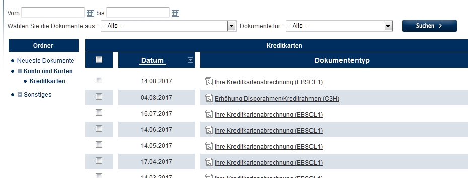 Beschreibung | Das Einlesen der gebuchten Umsätze bricht ab, falls in der Dokumentenliste neben den Kreditkartenabrechnungen noch sonstige Dokumente vorhanden sind. | ||||